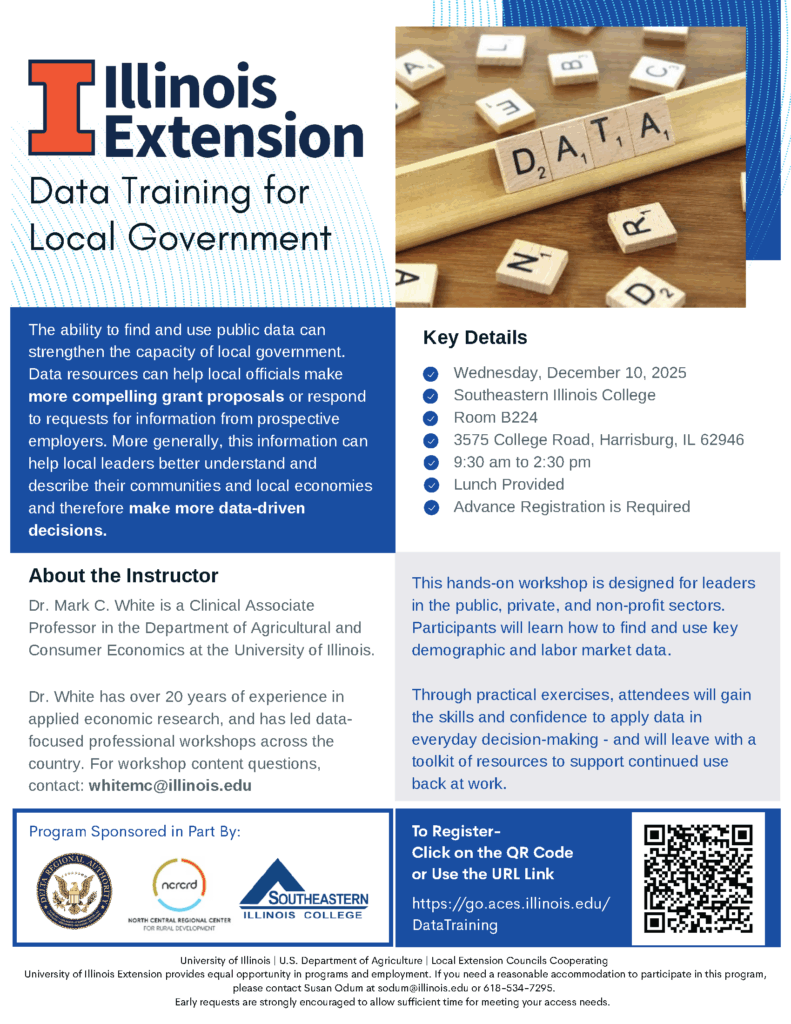 Leaders in the public, private and nonprofit sectors are invited to attend the Illinois Extension’s Data Training for Local Government, a hands-on workshop designed to teach participants how to find and use key demographic and labor market data to better understand and describe their communities and local economies and make more data-driven decisions. For more information about the workshop, download the event flyer here.